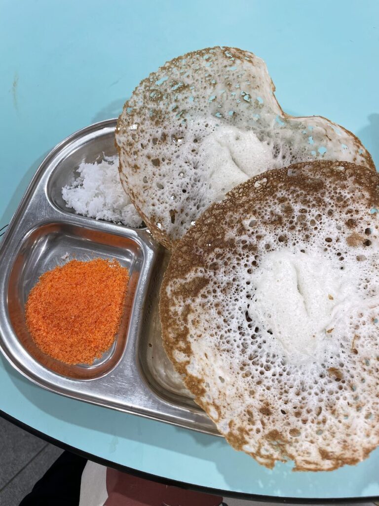Appom is a traditional fermented pancake of India made with blended rice. It looks like a flying saucer because of it's spongy dome-like centre and frilly, crispy edges. In Singapore appom is served with orange sugar and fresh grated coconut