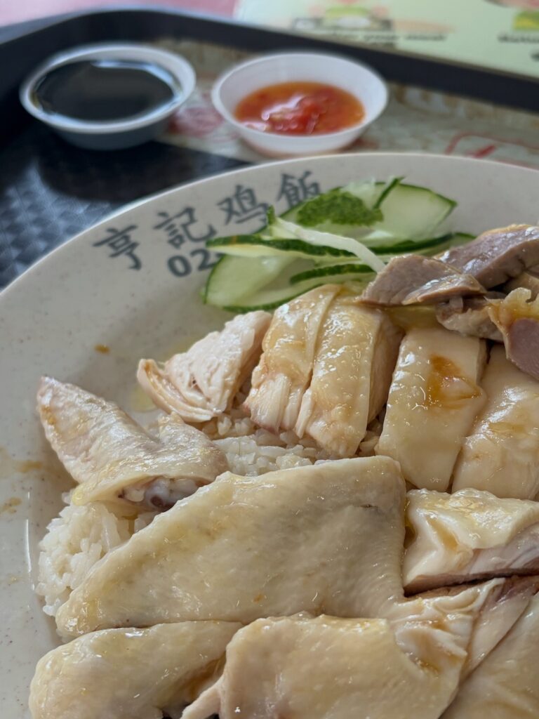 In a large pot of tap water submerge chicken. Bring to boil and turn chicken over. Reduce to low simmer and cook for 20 minutes. Switch off heat, cover pot and keep chicken submerged for another 20 minutes. Reserve chicken stock for cooking rice, for garnish and for chilli sauce. Lift out chicken and place into ice water bath for about 15 minutes. Pat dry cooked chicken and rub all over with a little sesame oil and light soy sauce. Let rest for about 20 minutes till ready to serve and cut into portions.