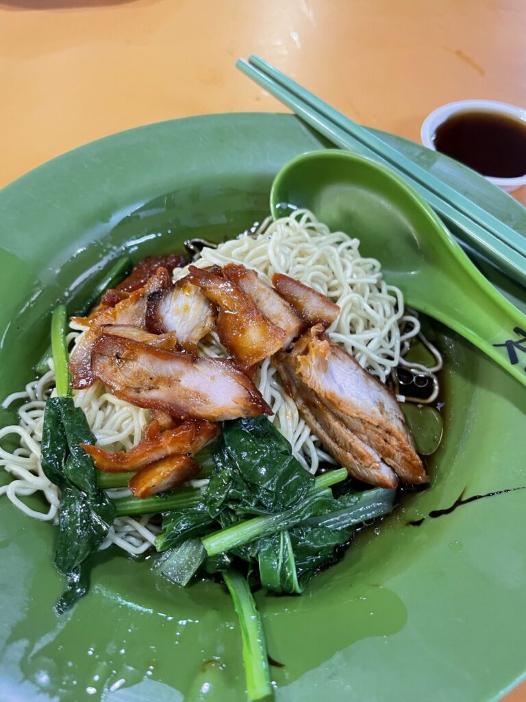 This popular dish is made with thin egg noodles, charsiew (barbecued pork), chye sim (mustard green) and dumplings of minced pork and prawn. The noodles are poached for a few seconds in hot water and then cooled in cold water for a nice springy, chewy texture. It is then tossed with sauces, sesame oil, lard oil and broth on a shallow serving plate. Originally from Guangzhou in China, wonton mee is served with chilli sauce and sliced pickled green chilli in light soy sauce.